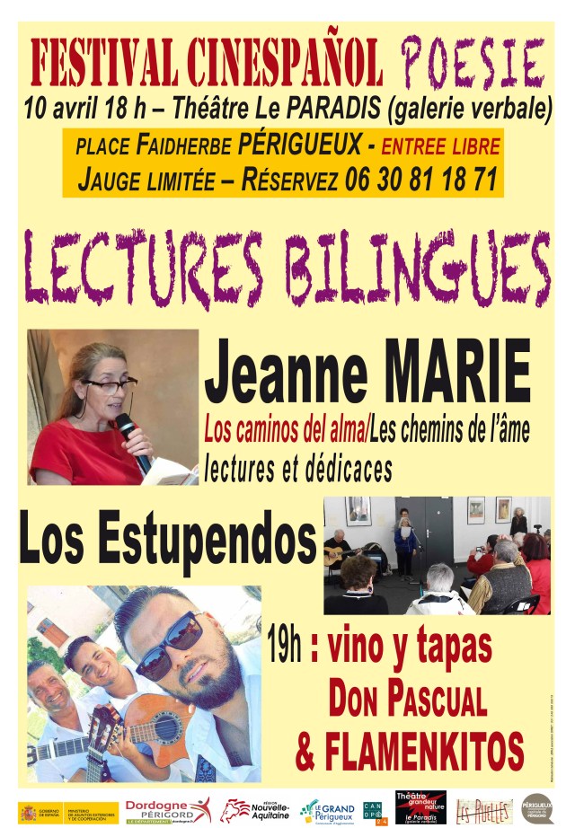 Vidéo intégrale de l’après-midi consacrée aux lectures poétiques par Jeanne Marie , journaliste, auteur et traductrice , spécialiste de la poésie espagnole de la » généración del 27″ contemporaine de Federico García Lorca et par Los Estupendos qui lisent des poésies contemporaines.