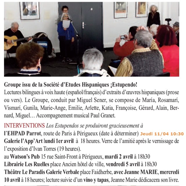 Los Estupendos Le 18 mars 201915 janvier 2020 par estupendo24dans Archives https://www.youtube.com/embed/yYAP3Sw6sLE » frameborder= »0″ allow= »accelerometer; autoplay; encrypted-media; gyroscope; picture-in-picture » allowfullscreen></iframe> Regardez la vidéo de quelques lectures de poésies espagnoles le 1er avril 2019 à la galerie l'App'Art de Périgueux Partagez Cinespañol Périgueux dans vos réseaux Cliquer pour partager sur X(ouvre dans une nouvelle fenêtre) X Plus Cliquez pour partager sur Facebook(ouvre dans une nouvelle fenêtre) Facebook Cliquer pour envoyer un lien par e-mail à un ami(ouvre dans une nouvelle fenêtre) E-mail J’aime chargement…