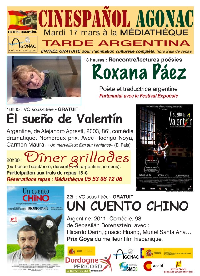 Agonac soirée hispanique Argentine mardi 17 mars Le 25 février 20204 mars 2020 par Cinespañol Périgueuxdans Non classé A la médiathèque. 18h rencontre en partenariat avec Expoésie avec Roxana Perez poète argentine. 18h45 film « El sueño de Valentín » Repas du gaucho (viande grillée, pommes de terre, dessert et vins argentins) 22h00 film « un cuento chino » Partagez Cinespañol Périgueux dans vos réseaux Cliquer pour partager sur X(ouvre dans une nouvelle fenêtre) X Plus Cliquez pour partager sur Facebook(ouvre dans une nouvelle fenêtre) Facebook Cliquer pour envoyer un lien par e-mail à un ami(ouvre dans une nouvelle fenêtre) E-mail J’aime chargement…