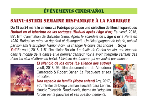 Semaine Hispanique à La Fabrique Le 5 mars 2020 par estupendo24dans Non classé Partagez Cinespañol Périgueux dans vos réseaux Cliquer pour partager sur X(ouvre dans une nouvelle fenêtre) X Plus Cliquez pour partager sur Facebook(ouvre dans une nouvelle fenêtre) Facebook Cliquer pour envoyer un lien par e-mail à un ami(ouvre dans une nouvelle fenêtre) E-mail J’aime chargement…